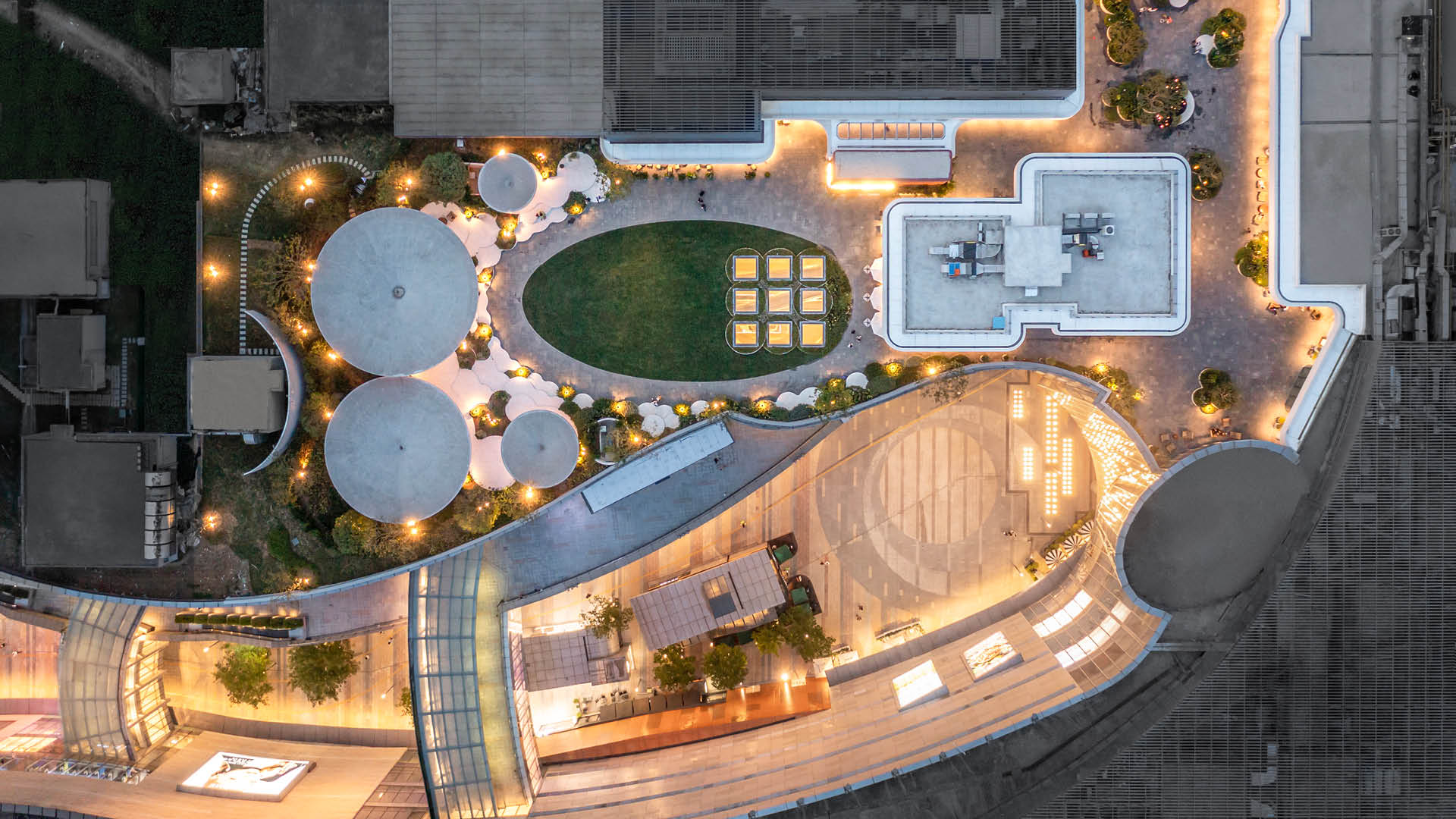 半开放的设计理念巧妙地将室内外空间自然融合,屋顶花园的各个区域相互连通,通过增设雨棚,确保全天候使用,使顾客不再受天气影响。集中餐饮区与六楼室内主动线联系明确,整合垂直交通,增强屋顶与裙楼的联系,形成六楼的环形动线。在繁忙的城市中,这里为访客提供了一片宁静和绿意。绿色景观与商业空间紧密结合,为消费者打造了全新的聚餐、娱乐和休闲的“打卡地”,让顾客重新体验城市天际线的美景,并吸引客群前往高楼层,享受独特的空间体验。